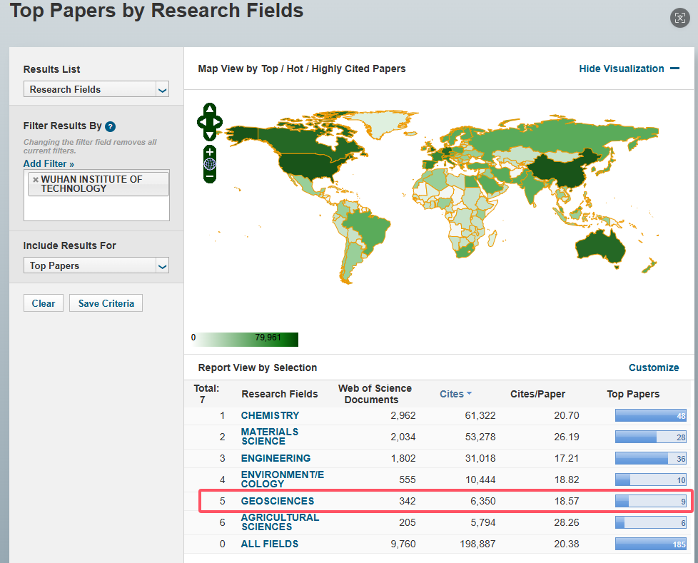 据统计,本期地球科学学科中全球进入前1%机构共计1195所,其中中国大陆共有110所高校入选。我校地球科学学科论文总数342篇,总被引频次6350次,高被引论文9篇,篇均被引18.57次,位列国内高校第31位。